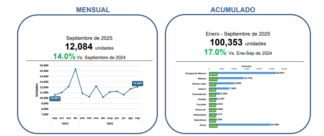 En el acumulado de enero a septiembre, el crecimiento es aún mayor, con un aumento de 17% frente al mismo periodo de 2024, alcanzando una participación promedio de 9.3% del mercado total.