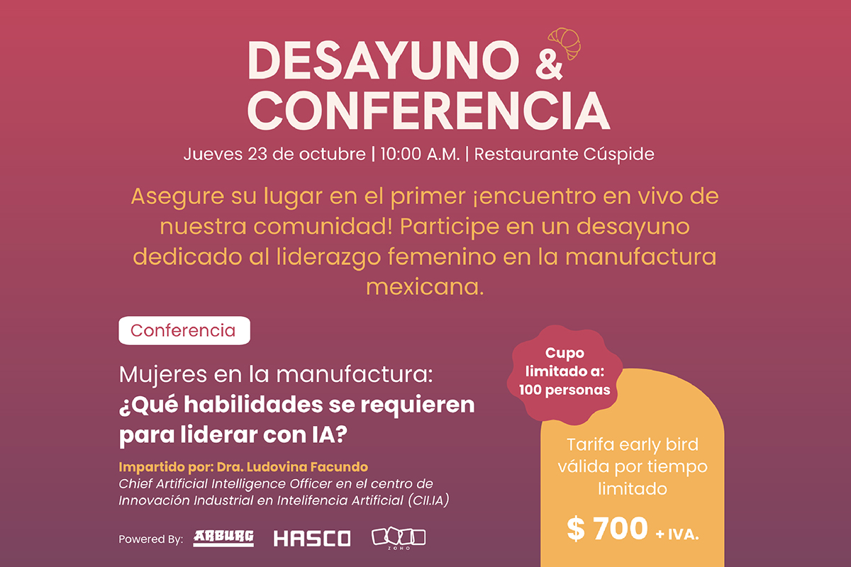 En el marco de Meximold 2025, se realizará el Desayuno de Mujeres en la Manufactura el jueves 23 de octubre a las 10:00 a.m. en el restaurante Cúspide, frente al Querétaro Centro de Congresos. La cita reunirá a profesionales, técnicas y directivas del sector manufacturero para reflexionar sobre los retos y oportunidades que trae la integración de la inteligencia artificial en los procesos industriales.