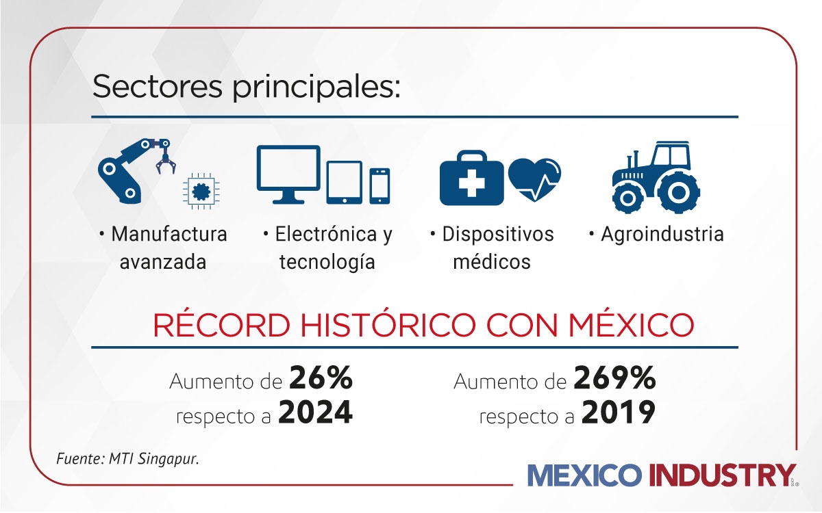 La Singapore-Mexico Chamber of Commerce señaló que este dinamismo refleja una expansión en las oportunidades de negocio entre ambas economías, particularmente en sectores estratégicos como manufactura avanzada, electrónicos, equipos médicos y agroindustria.