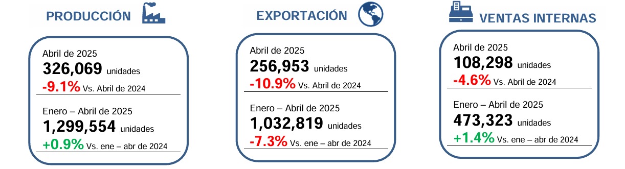 En cuanto a las ventas internas alcanzaron las 108,298 unidades, lo que representa una disminución del 4.6% en comparación con abril de 2024. A pesar de esta caída, el mercado interno se mantuvo por encima del umbral de los 100,000 vehículos vendidos, marcando así el quinto mes de abril consecutivo con ventas superiores a esa cifra.
