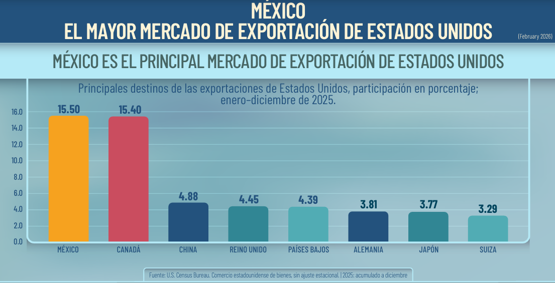 Aunque la diferencia fue marginal en términos porcentuales, el resultado marcó la estructura comercial de Norteamérica, al desplazar a Canadá como principal destino anual de las exportaciones estadounidenses.