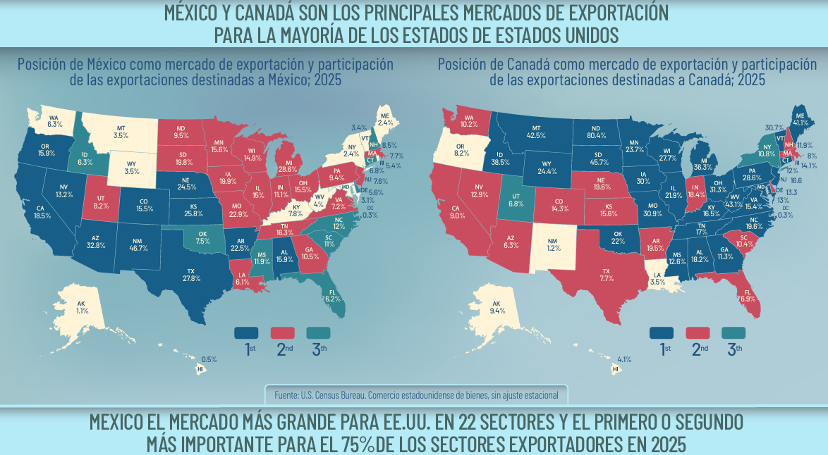 México y Canadá continúan siendo los principales mercados de exportación para la mayoría de los estados de la Unión Americana. En diversas entidades estadounidenses, México representa el primer destino de ventas externas, lo que incide directamente en el empleo manufacturero, la producción agrícola y la actividad logística.