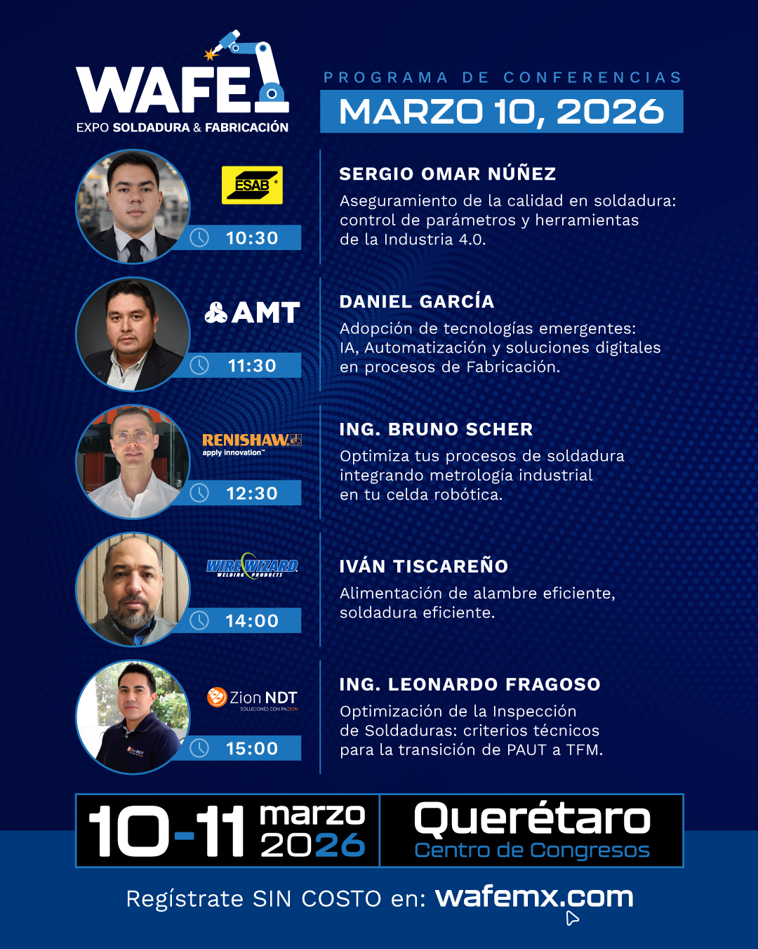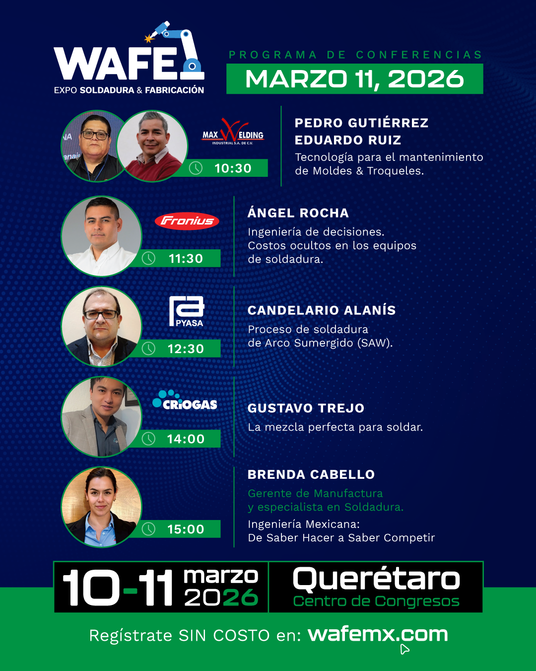 Durante los días 10 y 11 de marzo de 2026, especialistas y líderes tecnológicos compartirán casos reales, tendencias emergentes y soluciones aplicables en soldadura, automatización, metrología e Industria 4.0. El acceso al programa es sin costo, previo registro.